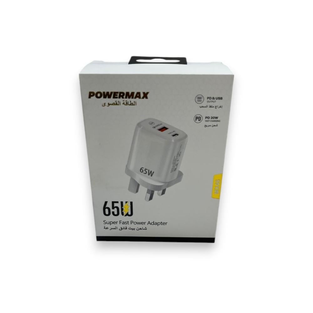 استمتع بشحن سريع مع **راس شاحن تايب سي** 65W من POWERMAX، الذي يجمع بين التصميم الأنيق والأداء العالي. هذا الشاحن الفائق السرعة هو الحل المثالي لتلبية احتياجاتك اليومية من الشحن.